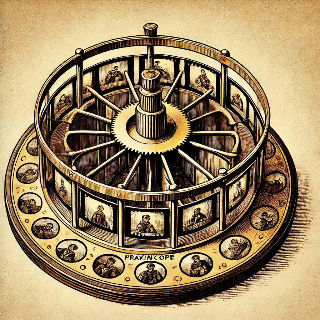 Créé par Émile Reynaud, le praxinoscope est un jouet optique qui améliorait les zoétropes existants. Il utilisait une série de miroirs pour créer une image animée plus fluide et plus lumineuse. Reynaud a ensuite développé le Théâtre Optique, qui utilisait une version avancée du praxinoscope pour projeter de longues séquences animées sur un écran.